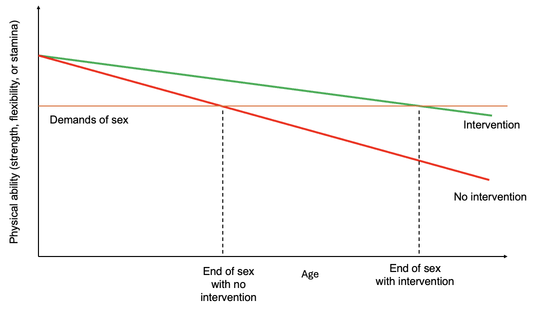 Consider the example of penis-in-vagina (PIV) sex. PIV sex requires some level of hip function for both partners. Figure two shows a conceptual diagram of when sex would end for one of the partners. The orange line represents the hip’s physical requirement during PIV sex in a specific position. When physical capability falls below the physical demands, PIV sex isn’t possible in that position (“end of sex with no intervention”). Betty Dodson’s “challenging our aging” intervention extends the number of years that PIV sex is possible. This is biomechanics in action: exercise is an intervention to reduce the rate at which we lose hip physical capacity. Moreover, for many people who haven’t been very physically active, starting an exercise program can not only slow the loss of capacity but actually increase it.