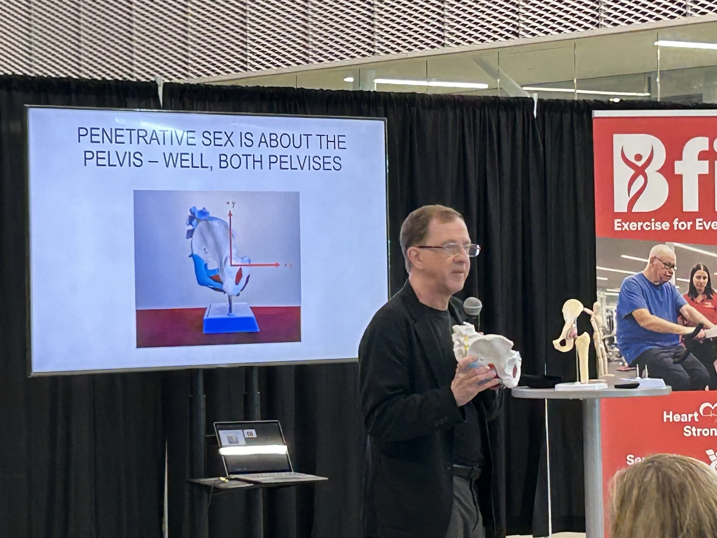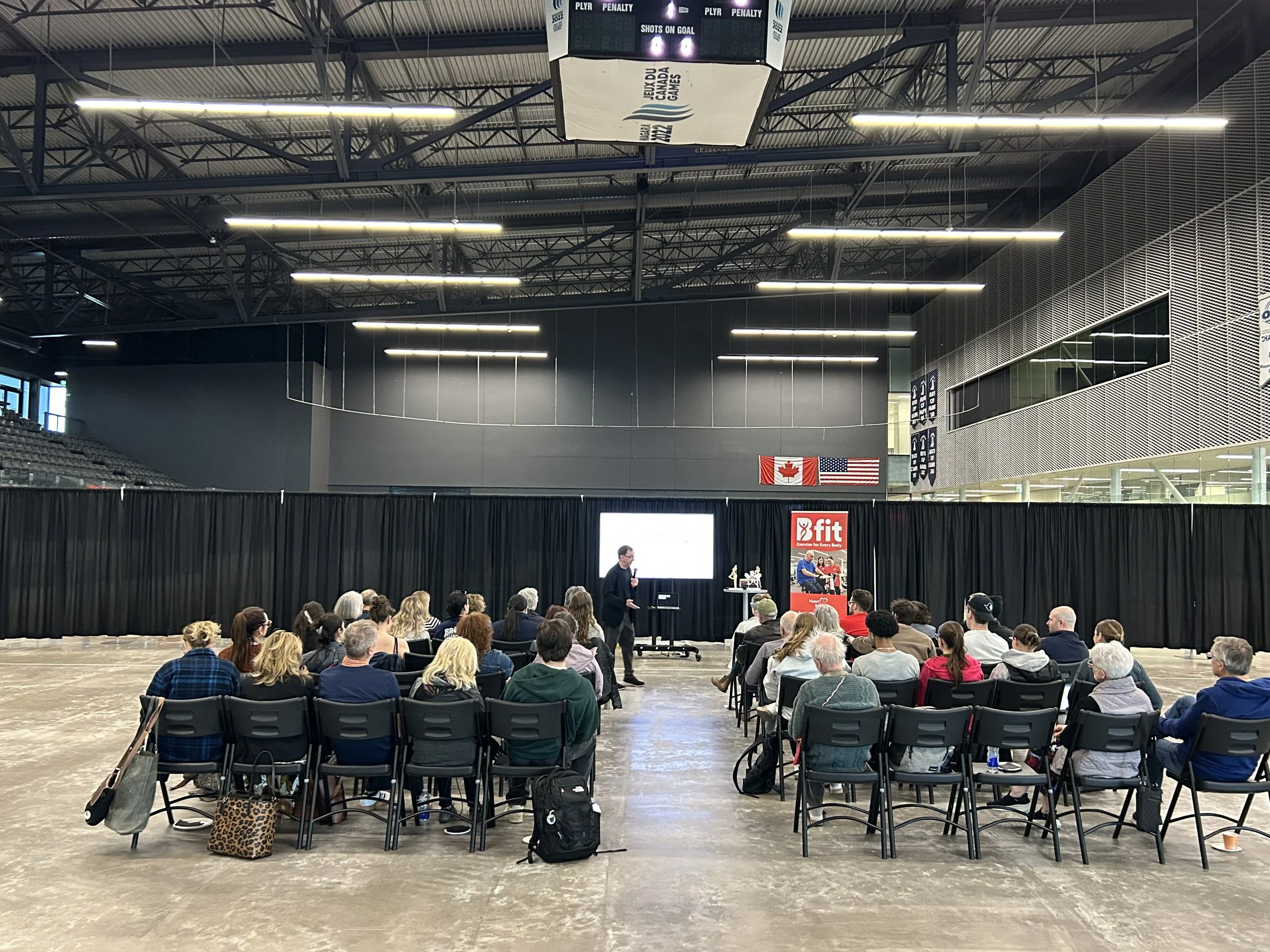I gave a lecture at the Brock Functional Inclusive Training (Bfit) program at Brock University in St. Catherines, Ontario, on April 9, 2026, titled “Aging Well, Living Fully: Biomechanics and Ergonomics and Sexual Well-Being.” Topics covered included resources on sex and aging, biomechanics of sex, and preventing hip dislocation during sex following total hip replacement. My hosts chose the Canada Games Park hockey arena as the venue, which is why it looks like chairs set on a sports arena floor.